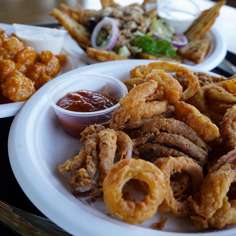 Fried calabash popcorn shrimp on toasted pita bread with lettuce, diced tomatoes, grilled peppers, grilled onions, and our homemade tzatziki sauce