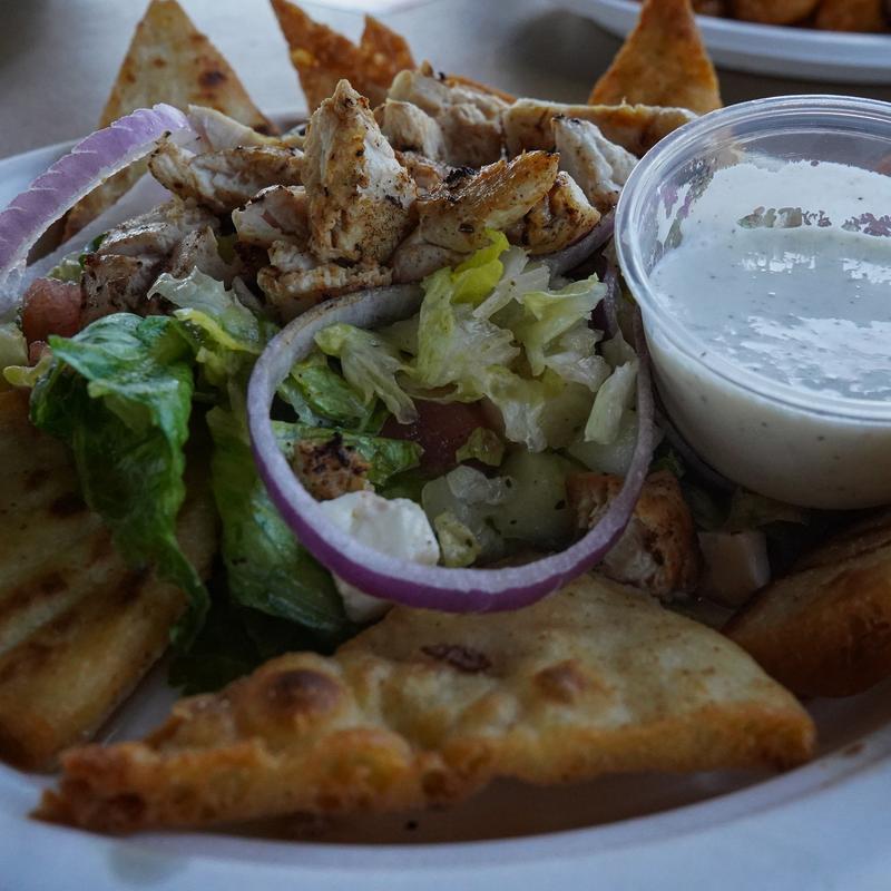 Side Greek salad on top of crispy pita points and topped with diced lamb or grilled chicken with one side of tzatziki sauce