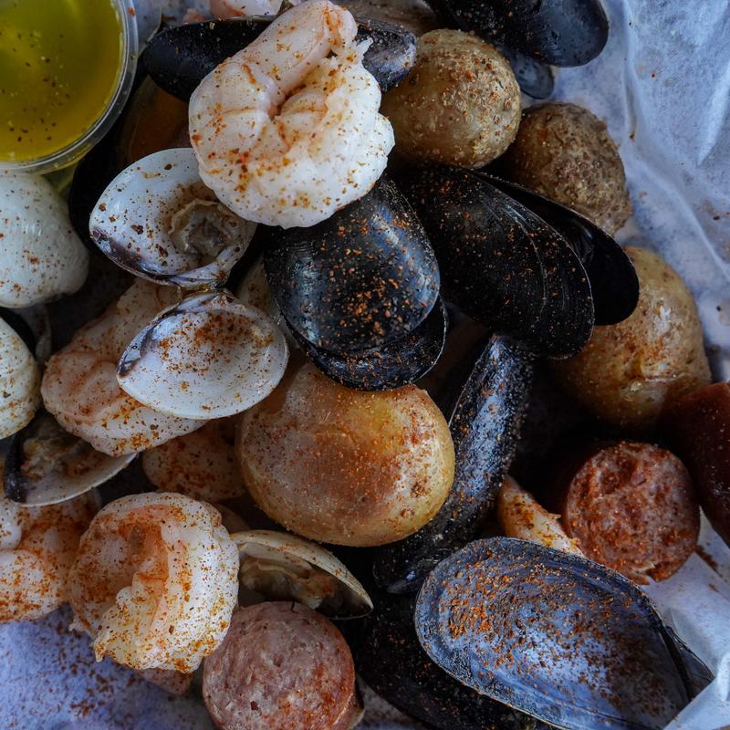 8 jumbo shrimp, 8 Prince Edward Island mussels, corn on the cob, kielbasa link sausage, and roasted potatoes. Comes with melted butter and cocktail or tartar sauce