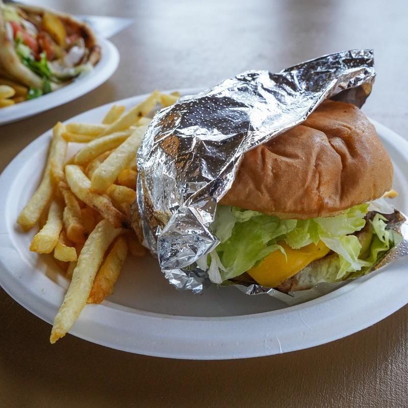 Lettuce, tomato, cucumbers, grilled onions, and grilled peppers are served ona choice of grilled pita bread or bun and crispy fries
